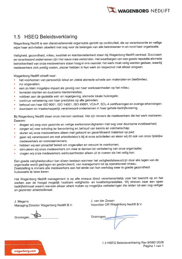 THAT is the safety objective Wagenborg Nedlift strives to achieve. To realise this, we commit to: